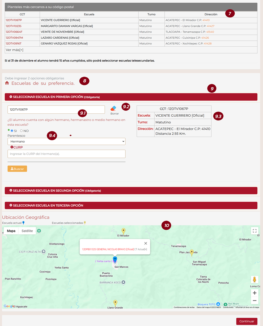 La sección de selección de escuelas brindará opciones al alumno, dependiendo si es un alumno de nuevo ingreso al sistema educativo estatal o si ya se encuentra cursando en Guerrero.