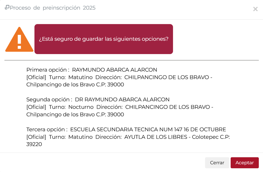 Para continuar con el proceso, se deberá pulsar el botón “Continuar”. El sistema mostrará una ventana emergente solicitando la confirmación con la(s) opción(es) seleccionadas. Si se desean modificar, seleccionar “Cerrar” para realizar las correcciones necesarias; caso contrario pulsar “Aceptar”.